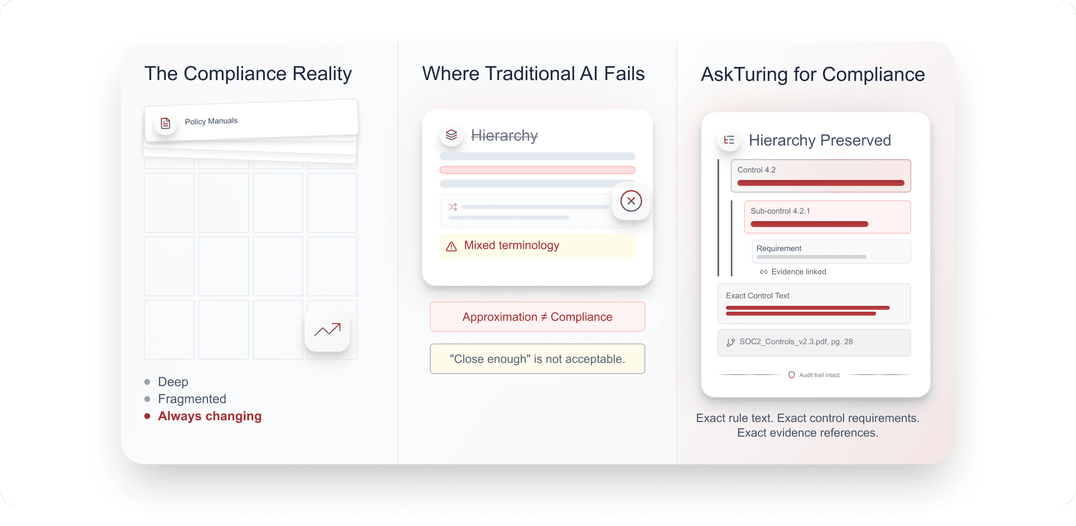 Compliance documents are highly structured with hierarchies, definitions, control mappings, and exceptions. AskTuring preserves these intricate relationships and maintains version-specific wording accurately.