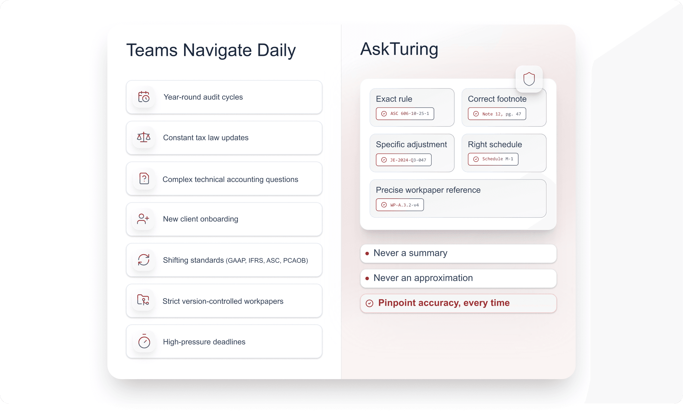 AskTuring gives accounting firms a private, precision-driven intelligence layer that retrieves the exact answer — with citations — across years of client files and internal standards. Fully private, fully accurate, and built for regulated environments.